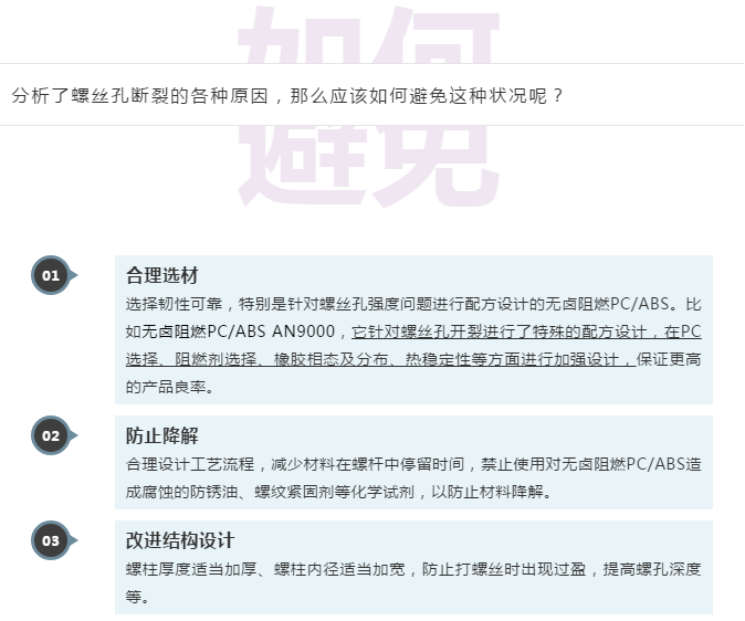然而,無(wú)鹵阻燃PC/ABS也不是萬(wàn)能的,用它做3C電子外殼產(chǎn)品,一個(gè)讓人頭疼的問(wèn)題是塑料螺孔處容易出現(xiàn)開(kāi)裂。