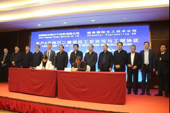 簽約儀式上,瑞典國際化工技術(shù)公司與河南峽光高分子材料公司負(fù)責(zé)人分別介紹項(xiàng)目及企業(yè)情況,并簽訂了年產(chǎn)5萬噸己二腈項(xiàng)目工藝許可與工程協(xié)議。