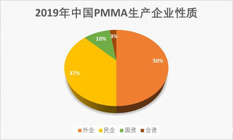 我國PMMA行業(yè)起步較晚,因此外商獨資企業(yè)是我國PMMA主要生產(chǎn)商,市場占比50%,如果不考慮裂解PMMA生產(chǎn)企業(yè)的產(chǎn)能,那么外企占比會達(dá)到65%,國內(nèi)的PMMA生產(chǎn)企業(yè)還有很大的提升空間,前景可期!