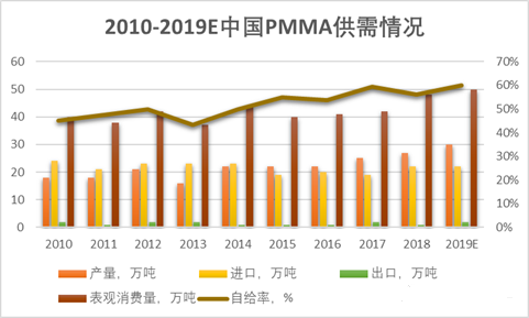 2019年,國內(nèi)PMMA產(chǎn)量會達(dá)到30萬噸,較2018年增長11%。隨著國內(nèi)PMMA產(chǎn)量的提升,自給率也在不斷地提高,由2010年的45%上升到2019年的60%。