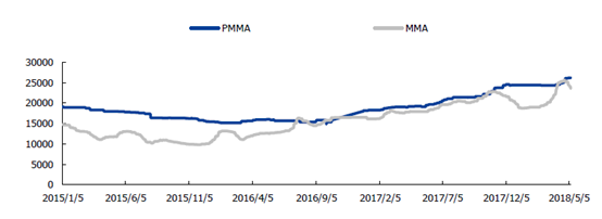 17 年開始MMA 經(jīng)歷了全球性的供應(yīng)緊缺,海外多個裝置均遭遇不可抗力,歐美亞等地區(qū)的MMA 都面臨供不應(yīng)求的局面,價格一路上漲,成本支撐下,PMMA 價格持續(xù)走高。