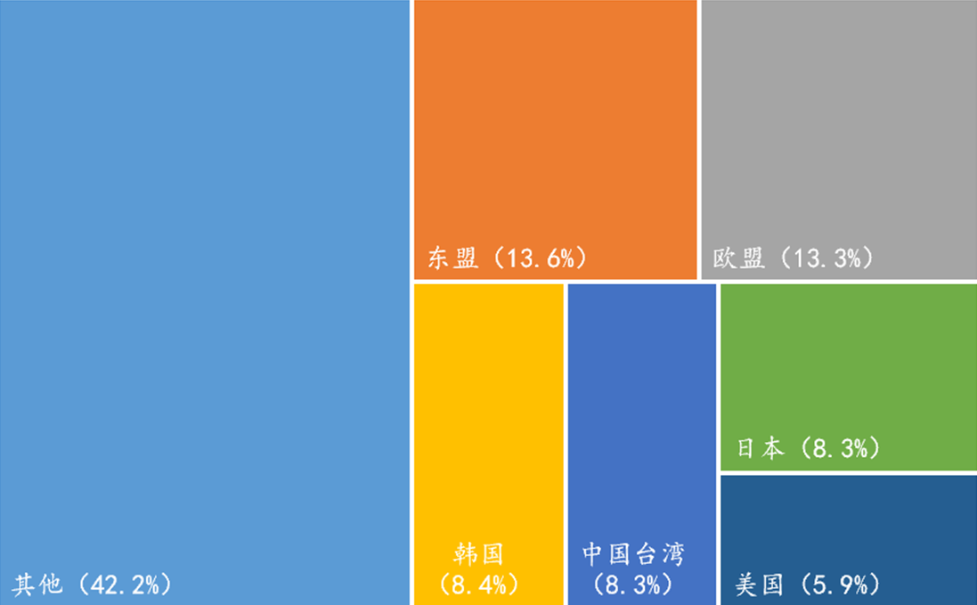 進口角度,2019年我國全年進口金額20771.0億美元,其中自日本進口比重達到8.3%,僅次于東盟(13.6%)、歐盟(13.3%)和韓國(8.4%)。