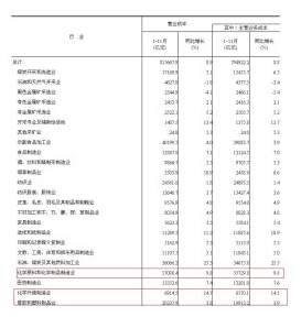 1-11月份,在41個工業大類行業中,34個行業利潤總額同比增加,7個行業減少。當中,石油和天然氣開采業增長3.3倍,化學原料和化學制品制造業增長19.1%。