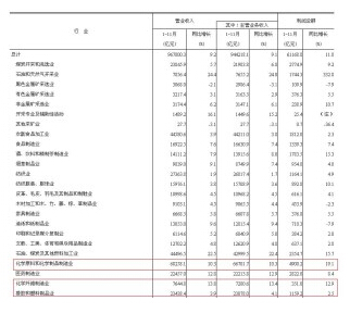 1-11月份,規模以上工業企業實現利潤總額61168.8億元,同比增長11.8 %。當中,化學原料和化學制品制造業實現利潤總額4900.2億元,同比增長19.1%;化學纖維制造業實現實現利潤總額351.0億元,同比增長12.9%;橡膠和塑料制品業實現實現利潤總額1159.2億元,同比增長2.5%;廢棄資源綜合利用業實現實現利潤總額186.1億元,同比增長27.3%。