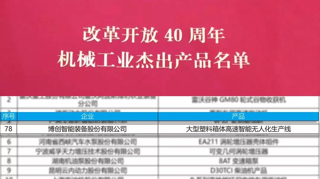 今年初,中機聯黨委下發了關于做好機械行業慶祝改革開放40周年系列活動的通知,其中改革開放40周年―機械工業杰出產品選樹活動,得到了行業廣泛響應。博創智能裝備股份有限公司的“大型塑料箱體高速智能無人化生產線”項目經行業組織推薦、征集辦公室和有關專家初審、專業協會復審、專家評審會再評審、中機聯會長辦公室確定等流程后,從330項申報項目中脫穎而出,成功入選《改革開放40周年機械工業杰出產品名單》。博創將不忘初心,不斷創新,為塑機行業添磚加瓦。