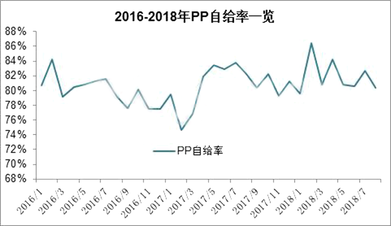 首先,自給率方面,隨著國內聚丙烯裝置產能不斷增加,石化生產企業產品種類不斷豐富,原料自給率不斷提高,如圖,2018年PP月度自給率平均在81.94%,略高于2017年的80.71%,預計2018年PP原料自給率較2017年提高1.52%。目前,中國聚丙烯每月仍有40-50萬噸聚丙烯需要從國外進口,但進口聚丙烯呈現增長趨勢的是高端原料,如抗沖共聚、管材、無規共聚等,通用料因原料同質化,及跌價行情中,進口聚丙烯到貨有時間及價格差,價格優勢不再明顯,通用聚丙烯進口量減少,進口依存度逐年降低,預計2018年PP進口依存度在20%以下。