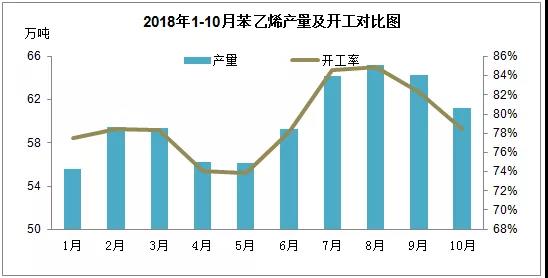 2018年,受利潤大幅提升,新裝置投產等因素影響,我國苯乙烯產量繼續呈現高速增長趨勢,截止到10月底,我國苯乙烯總產量在601萬噸,同比增幅11.1%。