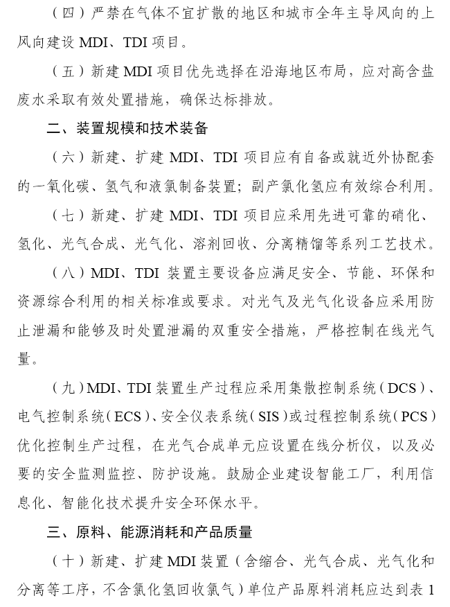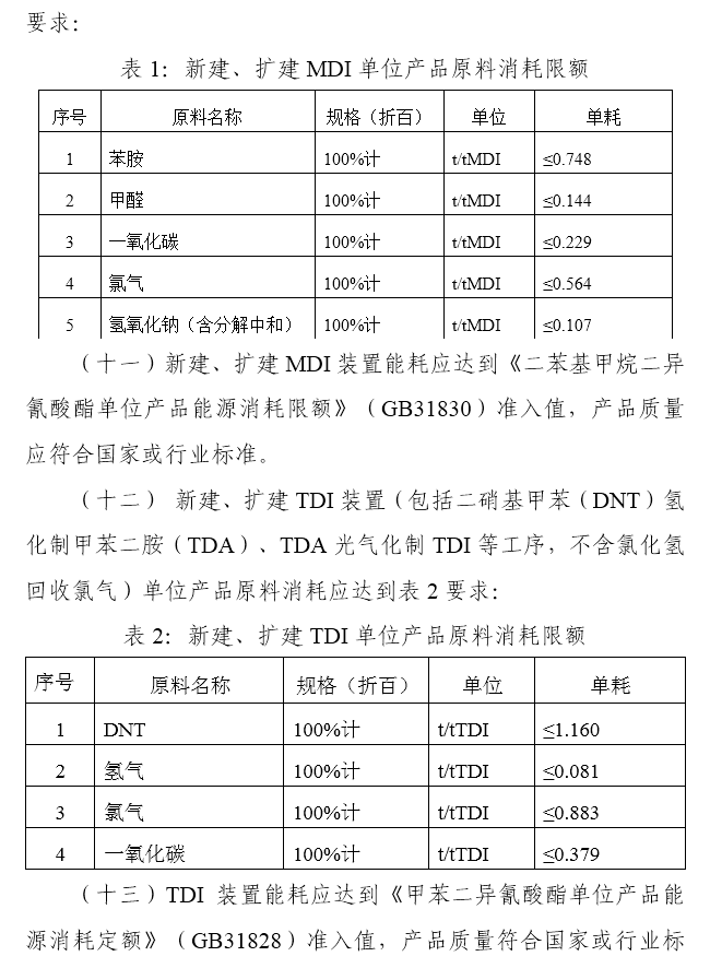 規范條件還對,新建、擴建MDI、TDI單位產品原料消耗限額作出了規定。