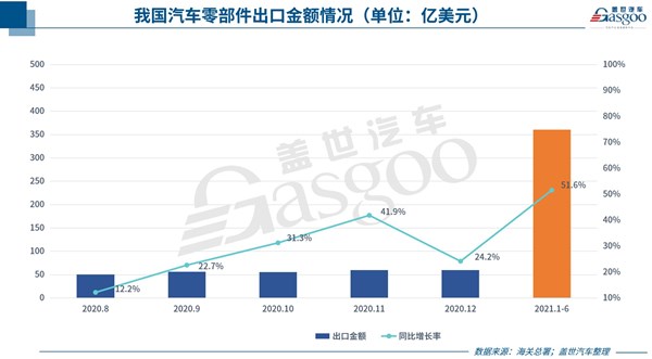進入2021年,我國汽車零部件出口繼續回暖。其中今年4月汽車零配件出口金額達到60億美元,同比增長50.7%,5月出口金額為59.8億美元,同比增長78.8%,6月相應金額則達到63.2億美元,同比增長70%。單月的良好表現使得今年上半年我國汽車零配件出口金額較去年同期實現了五成以上的增長。