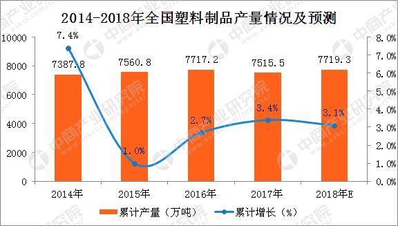 據中商產業研究院發布的《2018-2023年中國塑料制品行業市場前景及投資機會研究報告》數據統計顯示,自2015年來,中國塑料制品累計產量保持穩定增長的趨勢,年產量基本保持在7000-8000萬噸。具體來看,2017年中國塑料制品累計產量為7515.5萬噸,累計增長3.4%。據中商產業研究院數據預測,預計2018年中國塑料制品累計產量將達7719.3萬噸,累計增長約3.1%。