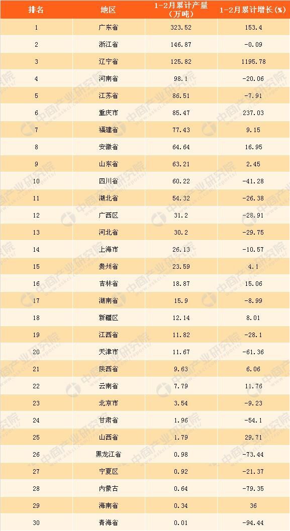 在2018年1-2月全國各省市塑料制品產量排行榜上,廣東省1-2月塑料制品累計產量323.52萬噸,累計增長153.4%,位居排行榜榜首。第二名是浙江省,2018年1-2月浙江塑料制品累計產量為146.87萬噸,累計下滑0.09%。遼寧省2018年1-2月塑料制品產量達125.82萬噸,累計增長19.87%。值得注意的是:2018年1-2月全國各省市塑料制品產量排行榜中,位列前三名的省份2018年1-2月塑料制品產量均達100萬噸以上。
