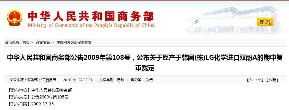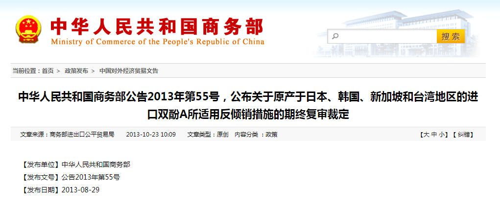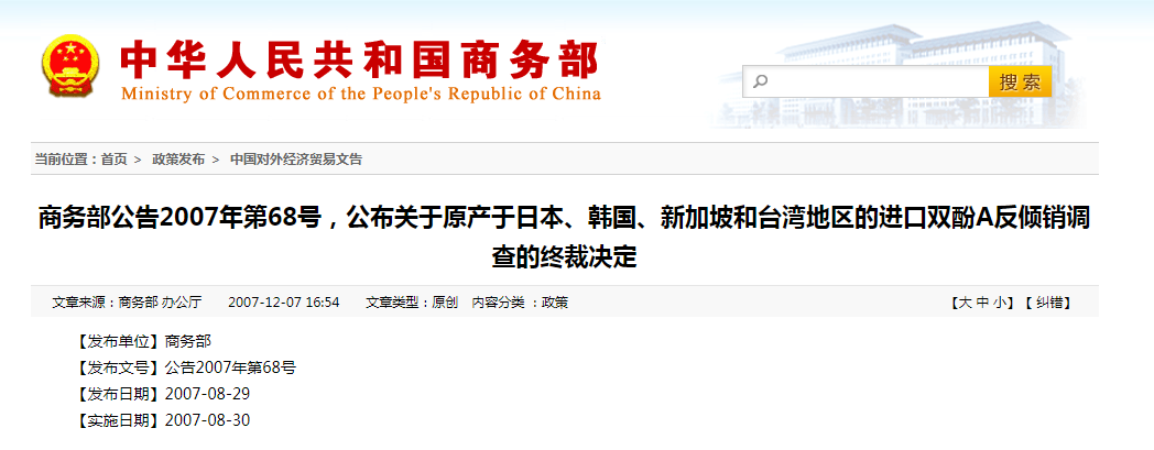 商務部:對日本等國產雙酚A反傾銷停止期終復審