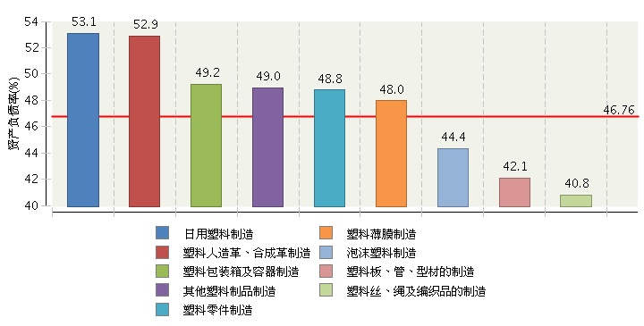 2017年上半年度,全國各地塑料制品行業(yè)資產(chǎn)負(fù)債率為46.76%。各子行業(yè)資產(chǎn)負(fù)債率狀況見下面的圖: