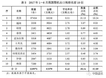 2017年1~6月,在我國塑機出口銷售市場排到前10位的我國中,出口至英國、印尼、泰國的和孟加拉提高較快,而出口至印尼和土爾其有很大下幅。在其中,出口至國外市場的總數為97414臺,同比增長141.62%,關鍵商品為三維打印機,總數占有率約97%。