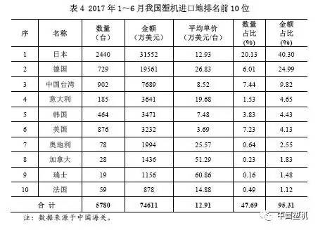 進口來源于地層面,2017年1~6月從亞洲地區進口塑機9974臺,金額約4.48億美金,各自占當期進口塑機的82.31%、57.29%,在其中從日本進口總數和金額各自同比增長37.78%、17.04%;從日本進口總數和金額各自同比增長50.65%、18.65%。