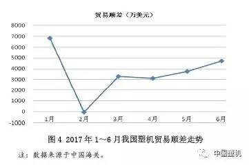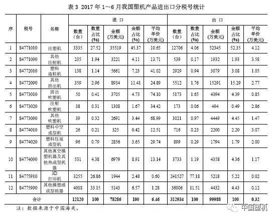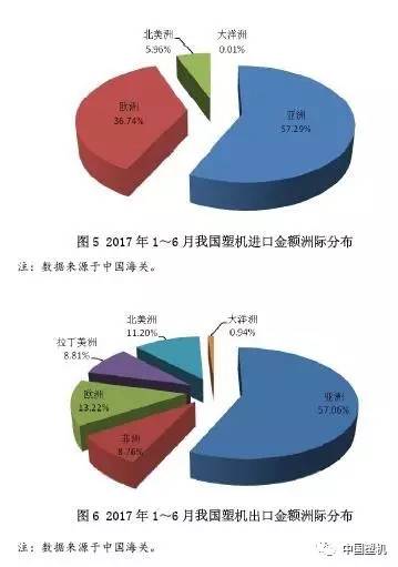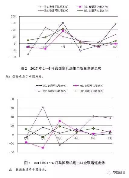 按貿易商品細分化,2017年1~6月在我國進口注塑機3335臺、金額3.55億美金,各自同比增長35%、41%;進口擠塑機497臺,同比增長19%,金額約1.46億美金,同比下降24%;進口吹塑機127臺,同比增長12%,金額770三萬美金,同比下降1%。