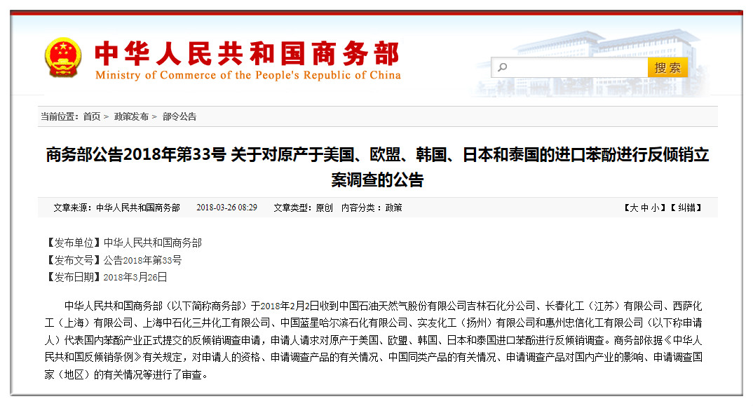 商務部決定自2018年3月26日起對原產于美國、歐盟、韓國、日本和泰國的進口苯酚進行反傾銷立案調查。