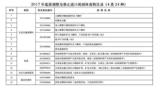 決定禁止進口的“洋垃圾”有4大類共24種,分別是來自生活源的廢塑料(8種)、未經分揀的廢紙(1種)、廢紡織品原料(11種)和釩渣(4種)。這一進口禁令已經從去年12月31日起執行。