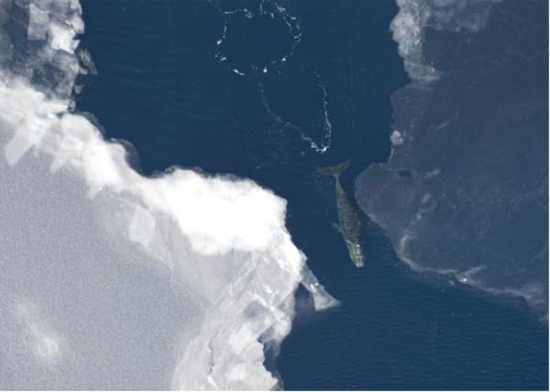 弓頭鯨把頭從冰塊兒中外伸來,圖片出處: Vicki Beaver/NOAA