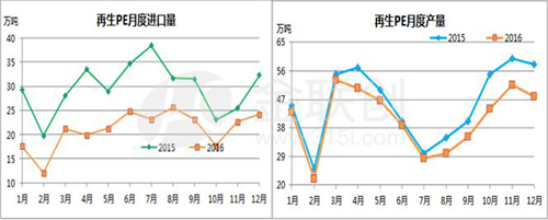 在環(huán)境保護(hù)颶風(fēng)下,迫不得已提便是塑料再生料,大家說白了的再生料,現(xiàn)階段中國(guó)中下游公司中,尤其是中小企業(yè),為了更好地減少產(chǎn)品成本擴(kuò)張盈利,依據(jù)不一樣層級(jí)商品規(guī)定在其生產(chǎn)制造原材料里加上一定占比的再生料,做到其商品達(dá)標(biāo)盈利豐厚的理性化,從圖上看,與2015年對(duì)比,2016年P(guān)E生產(chǎn)量及出口量降低顯著,尤其是出口量減幅很大,預(yù)估2017年減幅將遠(yuǎn)遠(yuǎn)地超出2016年,在環(huán)境保護(hù)全力懲處下,再生料供貨將再次降低。