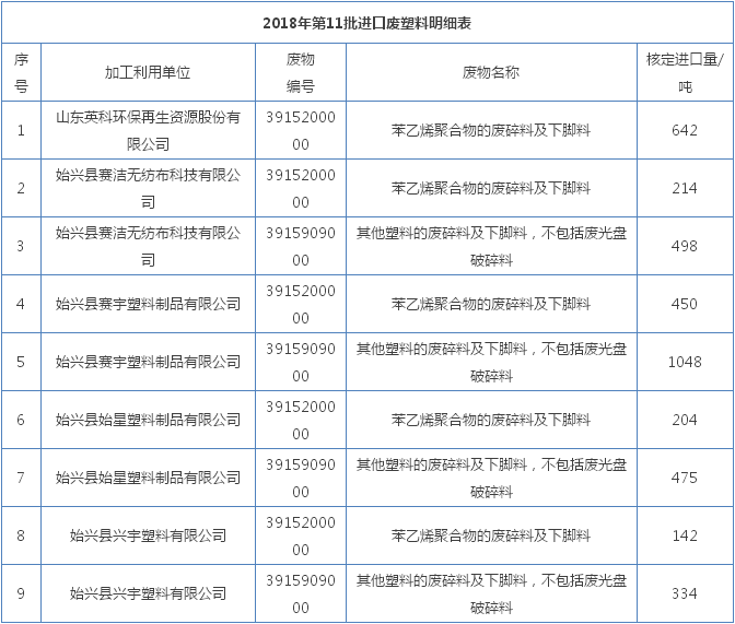 4月28日,2018年第11批建議批準的限制進口類申請明細表公示,共有5家廢塑料加工利用企業獲得批文,核定進口總量為4007噸。