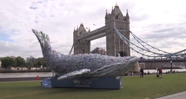 圖為美國人在泰晤士河邊上做成的約長10英尺的鯨魚實體模型,警告大家保護環境,維護鯨魚。