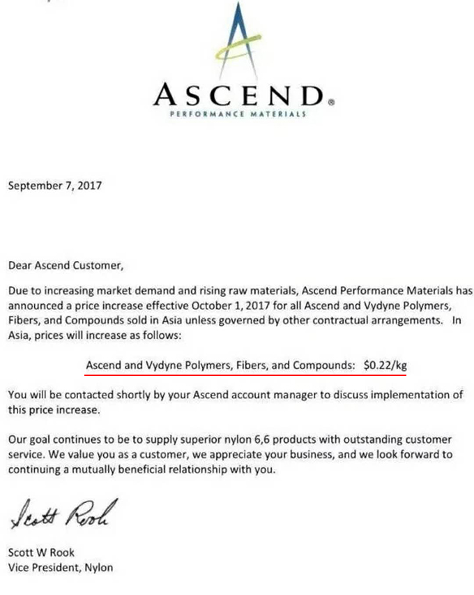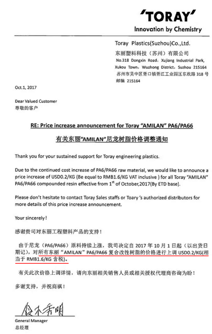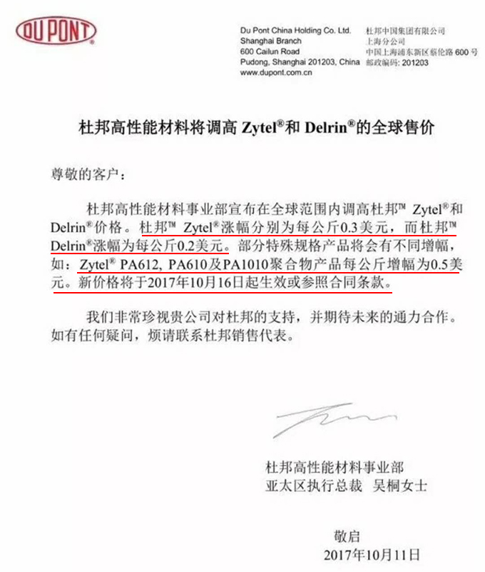 8月中旬,杜邦再發漲價函,宣布上調杜邦DuPont Rynite改性聚對苯二甲酸乙二醇酯(PET)價格,調整如下: 2018年9月1日起, 杜邦Rynite系列產品 價格上調 300美元/噸(折合人民幣2074元/噸)...