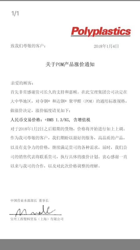 2018年8月21日,新光工業(杭州)有限公司發布PBT價格調漲通知:即日起,PBT全系列調漲800元/噸。 附:漲價函見下圖。 這是繼長春化工連調兩次PBT價格后,又一廠家發布關于PBT的調價函。...