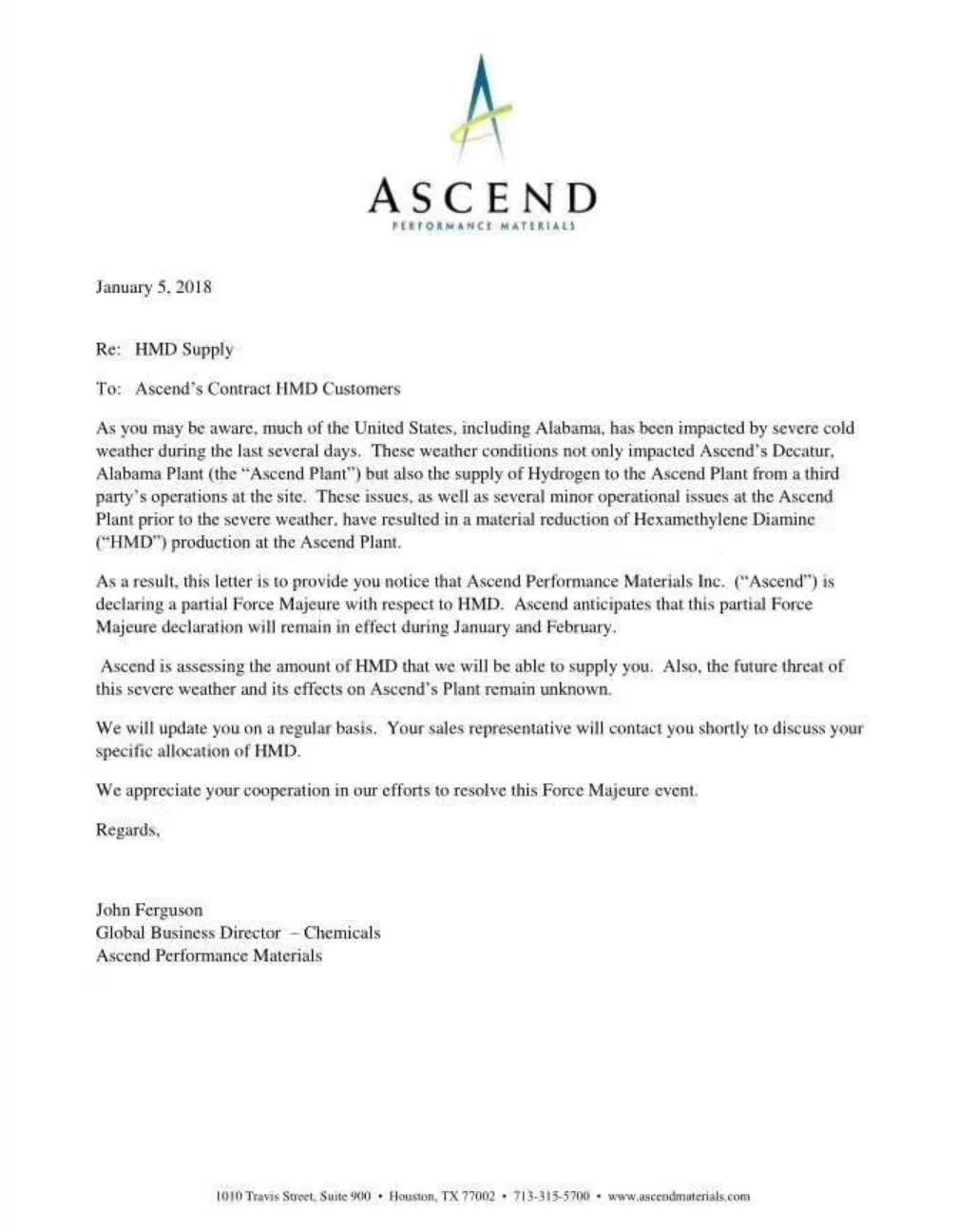 近日,多家品牌廠商紛紛發出通告,宣布己二腈生產遭遇不可抗力, 1.朗盛 2018年2月26日,朗盛發布對PA66供應的預警: Solvay和Invista(唯一的歐洲生產商)已宣布對關鍵PA66前體己二腈產...