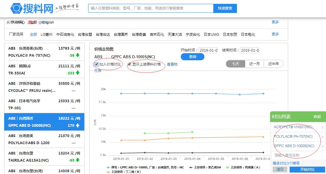 搜料網價格專題不僅收錄了超3000多種材料型號的各個主流廠家價格,還有各個產品上游單體價格,同時您也可以選擇其他牌號產品與當前產品進行價格比對。如果您是塑料行業的新人,搜料網可以幫助您及時了解市場價格;如果您是塑料行業專家,搜料網將和您共同把握市場。