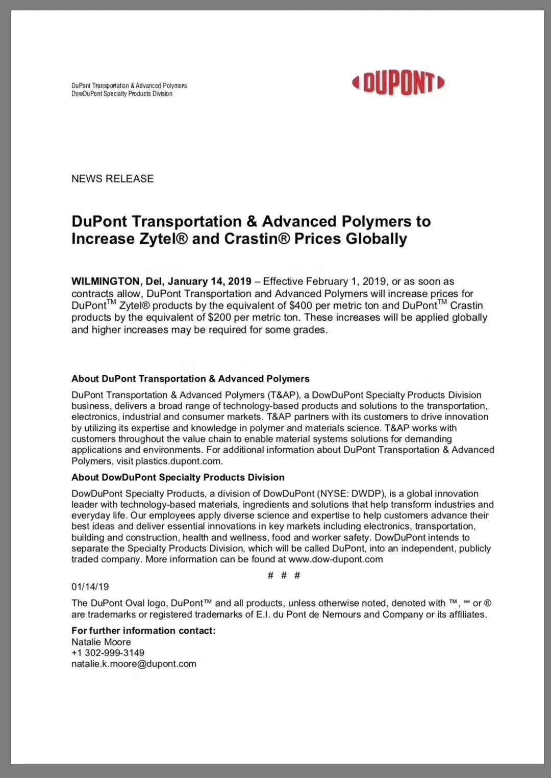 2019年1月14日消息,杜邦運輸和先進的聚合物宣布將在全球范圍內提高所有