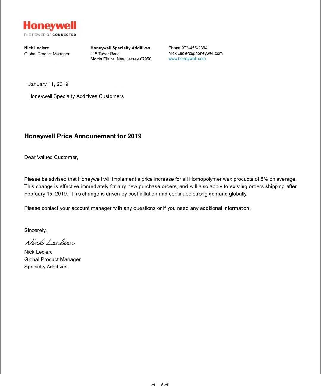 2019年1月11日,霍尼韋爾(honeywell)發布漲價函,對所有均聚物產品平均提價5%。
