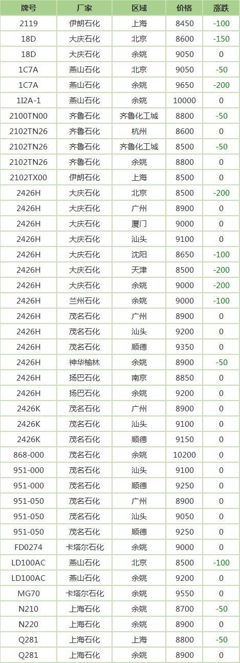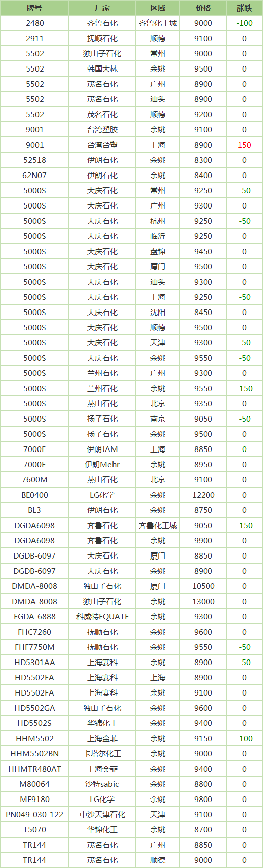 已有人閱讀此文 - -PE市場氛圍偏弱。企業(yè)方面,兩油庫存下降緩慢,主力大區(qū)銷售公司線性、高壓及低壓拉絲等開單價下調(diào),幅度在50一150元/噸。線性期貨延續(xù)弱勢,現(xiàn)貨市場交投氛圍清淡,商家低報尋成交,市場成交重心下移。截止午間收盤,華北地區(qū)波幅50一150元/噸;華東地區(qū)降50一100元/噸;華南地區(qū)部分小跌50元/噸上