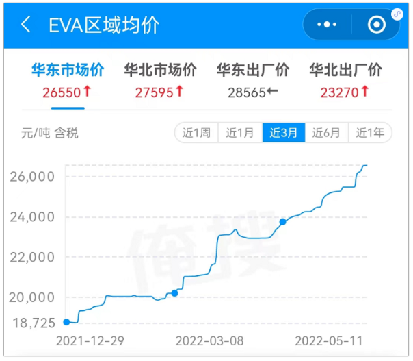 從EVA華東市場來看:自年初以來,EVA轉跌為漲,華東市場主流均價從當初的18725元/噸,一路開漲,截至5月11日,EVA華東市場主流均價漲至26550元/噸,短短三個月,暴漲近8000元!