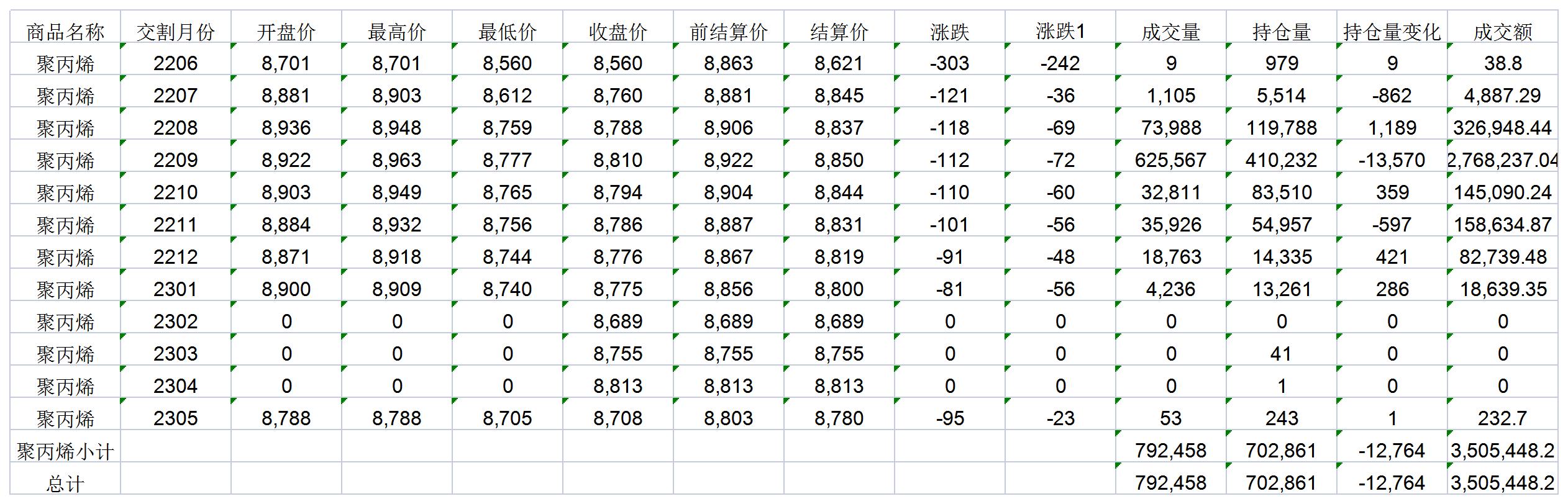 大連商品交易所6月21日PP行情表