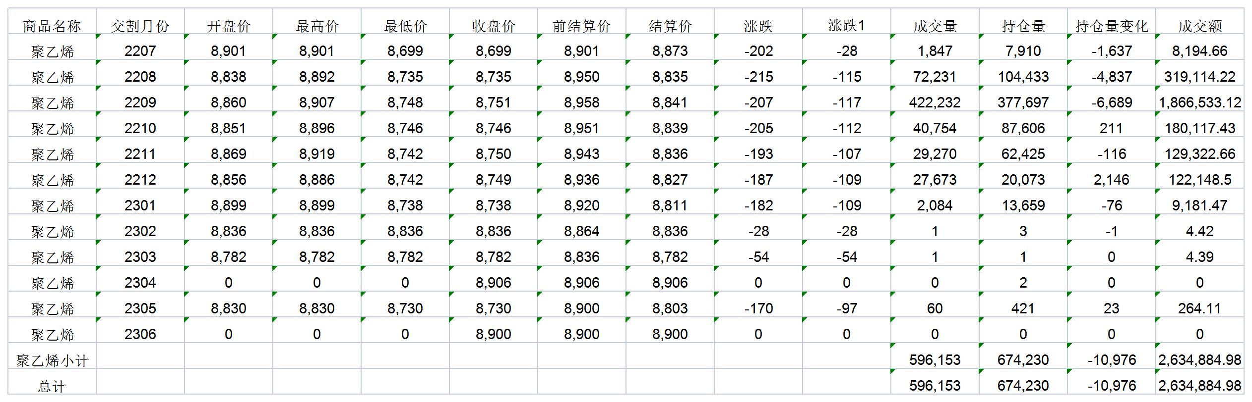 大連商品交易所6月21日PP行情表