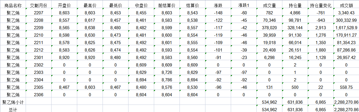 大連商品交易所6月22日PE行情表