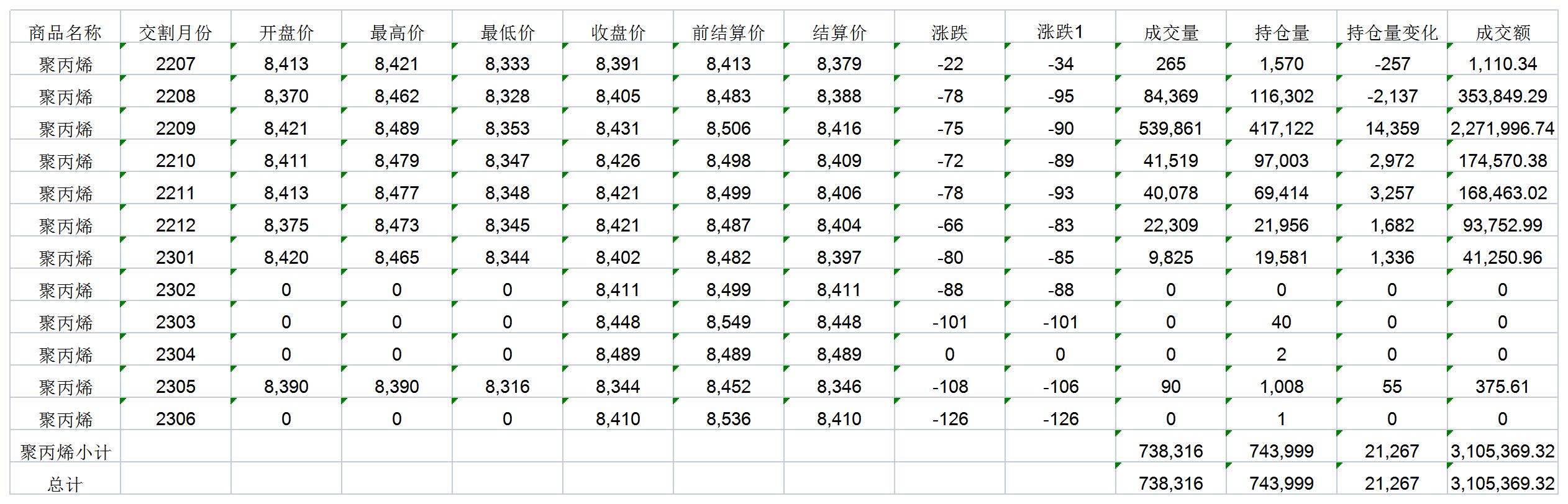 大連商品交易所6月23日PP行情表