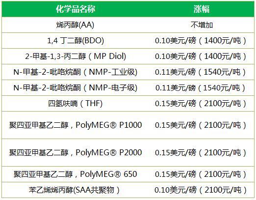 自2018年4月1日起,或合同允許之日,利安德化學公司將增加以下的1,4丁二醇及衍生品的價格:
