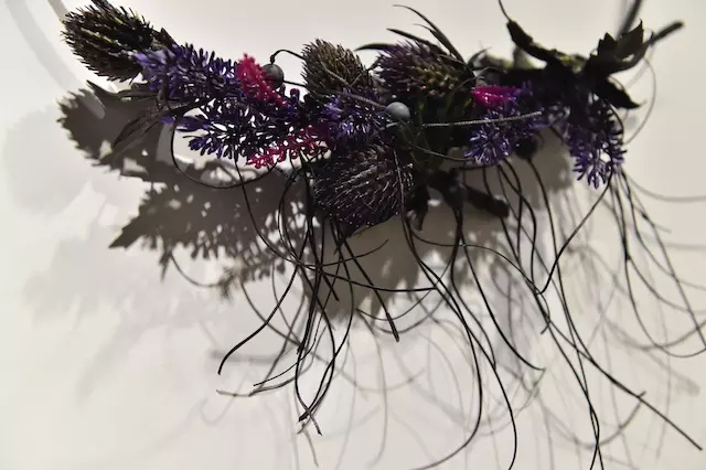 這些飾品不僅可以被佩戴在身上,還能掛在墻上作為裝飾品。每一件都是獨一無二的。有時候,Simeoni 還會收到人們寄來的假花,為客戶定制首飾。