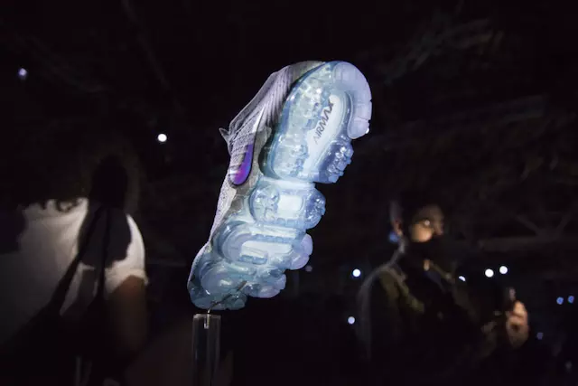 這些小顆粒會(huì)被制成一種相貌普通的塑料板。但據(jù)耐克 AIR 制造創(chuàng)新部門的副總裁 Lailit Montiero 透露,制作 Vapormax 的塑料板本身有特殊的成分。因?yàn)?Vapormax 鞋底一體成型,從塑料板到最終的成品都在一條流水作業(yè)的機(jī)器組里完成,所以除了最終的上色之外,并不存在額外添加的工序。制作 Vapormax 鞋底的機(jī)器大過一輛校車,從熱塑成型、邊緣切割到充氣,基本上都由機(jī)械手完成,只需要一個(gè)工人在一旁作業(yè)。Lailit Montiero 說,“最終機(jī)器會(huì)把氮?dú)鈴臉O細(xì)的針孔里注入切割好的鞋底。”經(jīng)過質(zhì)檢之后,這些鞋墊會(huì)被運(yùn)至韓國,由那邊的耐克工廠完成 Vapormax 的最后制造。