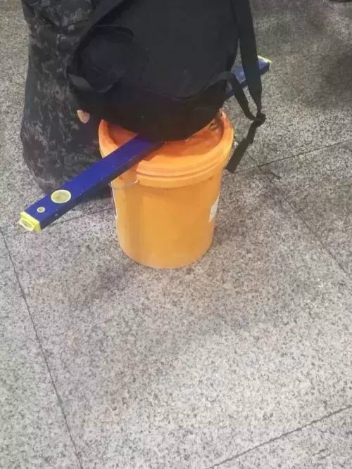 一位候車小哥甚至帶了30多個這樣的白色涂料桶回家