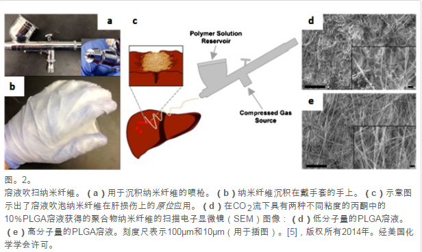 已經(jīng)開(kāi)發(fā)了溶液吹絲技術(shù),以克服傳統(tǒng)靜電紡絲技術(shù)所具有的各種限制,如納米纖維的原位合成困難以及高電位和導(dǎo)電目標(biāo)的要求[5]。僅需要一個(gè)簡(jiǎn)單的商用噴槍,濃縮聚合物溶液和壓縮氣體源,該技術(shù)可能潛在地用于納米纖維氈和支架的原位沉積,用于非導(dǎo)電靶的適形覆蓋以及許多組織工程和外科應(yīng)用。這種合成方法的應(yīng)用實(shí)例是僅使用噴漆刷和高壓CO 2氣體在任何基材上原位沉積保形PLGA納米纖維墊或網(wǎng)孔(圖2 a - c)[5]。在報(bào)告中,聚合物納米纖維是由丙酮中的10%PLGA溶液合成的,兩種不同的粘度對(duì)應(yīng)于CO 2流下的低分子量和高分子量(圖 2d和e)。所制備的納米纖維的平均直徑為470±260nm。由于將當(dāng)前的靜電紡絲方法轉(zhuǎn)化為原位設(shè)置是具有挑戰(zhàn)性的,