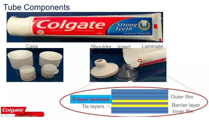 牙膏管的組成復雜,包括瓶蓋、牙膏軟管以及其他構件。一根牙膏管由不同塑料組合,夾在一層薄薄的鋁片上。