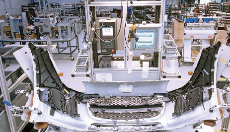 坐落于美國布羅姆亞德的POLYTEC 企業的捷豹F 型前保險杠的智能化安裝站。保險桿由提高反映注入成形聚氨酯材料做成(圖片由POLYTEC集團公司出示)。