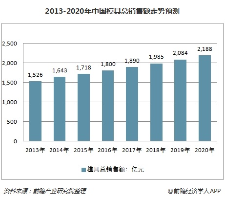 據前瞻產業研究院發布的《中國模具行業發展前景預測與投資戰略規劃分析報告》數據顯示,我國模具制造廠點約30000家,從業人員約100萬人。2016年全國模具總銷售額達到了1800億元。2013年至2015年,我國模具總銷售額的年均復合增長率達到 6.1%。預計2018年全國模具總銷售額及將接近2000億元,預計到了2020年全國模具總銷售額將達2188億元。