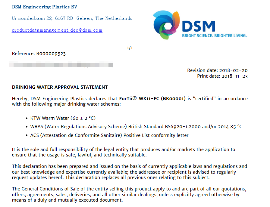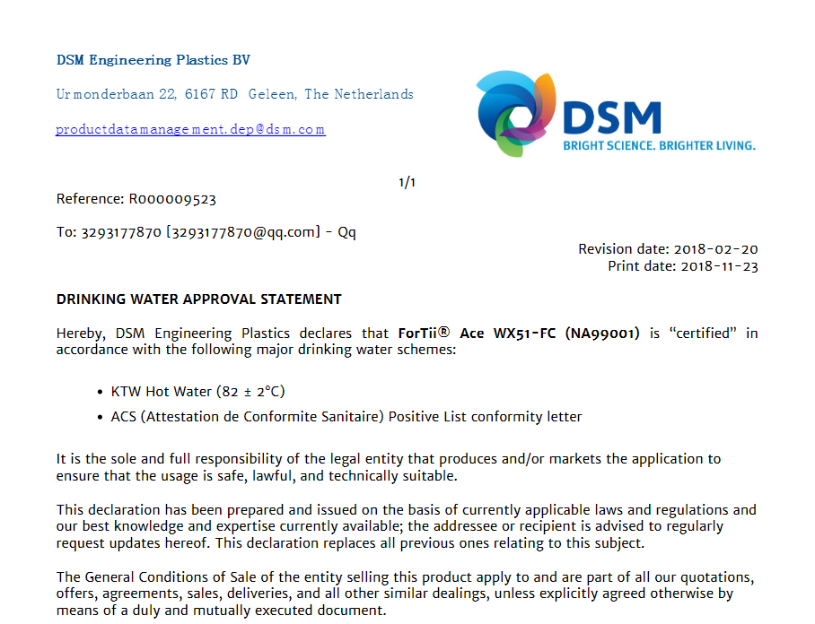 主要作用:水龍頭和混合器,管,衛(wèi)生器具,水表,防逆流裝置,流量計(jì),閥和水桶,還有諸如洗衣機(jī)和洗碗機(jī),車輛清洗設(shè)備等器具產(chǎn)品的原材料符合要求。