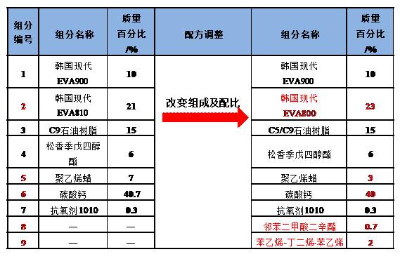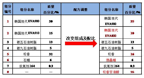 在確保配方黏稠度和粘合抗壓強度不會改變的前提條件下,提升膠的強度和軟化點是配方調(diào)整的方位。配方里將石臘換為微晶蠟,提升了軟化點和耐熱性,松香甘油酯比松脂的耐熱性性能高且能提升膠的粘合抗壓強度。就EVA環(huán)氧樹脂的調(diào)整而言,EVA800強度高、軟化點高,但若只將EVA910換為EVA800,膠的黏稠度則升高,因此將15份EVA910分派為10份EVA800和5份EVA900。