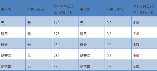 表 2不一樣著色劑對含苯并三唑的髙壓聚乙烯薄膜的光穩定性的危害