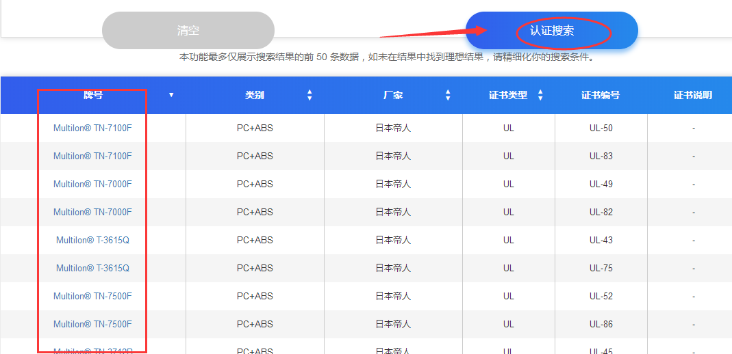 3.或者輸入你知道的UL編號,廠家、牌號、類別,就可以查看對應的黃卡數據。